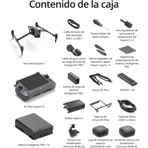 Componentes incluidos | Aeronave Inspire 3 ×1, Amortiguadores de goma para el estabilizador del Inspire 3 ×2, Batería inteligente TB51 ×6, Cable CA para centro de carga de baterías inteligentes TB51 ×1, Cable de datos USB-C a USB-A ×1, Cable de datos de alta velocidad USB-C a USB-C ×1, Caja de transporte de objetivo (18/24/35/50 mm) ×1, Centro de carga de baterías inteligentes TB51 ×1, Correa RC Plus ×1, Cámara con estabilizador Zenmuse X9-8K Air ×1, Destornillador de doble extremo ×1, Funda de cámara con estabilizador Zenmuse X9-8K Air ×1, Hélices plegables de liberación rápida Inspire 3 (par) ×3, Maleta Inspire 3 ×1, PROSSD 1TB ×1, Pegatina de emparejamiento de baterías inteligentes TB51 ×1, RC Plus (Inspire 3) ×1, Soporte de cintura RC Plus ×1carga de baterías inteligentes TB51 ×1, Cable de datos USB-C a USB-A ×1, Cable de datos de alta velocidad USB-C a USB-C ×1, Caja de transporte de objetivo (18/24/35/50 mm) ×1, Centro de carga de baterías inteligentes TB51 ×1, Correa RC Plus ×1, Cámara con estabilizador Zenmuse X9-8K Air ×1, Destornillador de doble extremo ×1, Funda de cámara con estabilizador Zenmuse X9-8K Air ×1, Hélices plegables de liberación rápida Inspire 3 (par) ×3, Maleta Inspire 3 ×1, PROSSD 1TB ×1, Pegatina de emparejamiento de baterías inteligentes TB51 ×1, RC Plus (Inspire 3) ×1, Soporte de cintura RC Plus ×1 |